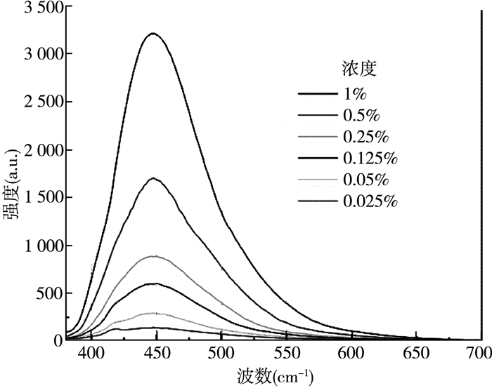 将所制备的CDs样品浓缩或稀释至质量分数为1%,作为2#-1样本;然后用去离子水分别稀释至CDs质量分数为0.5%、0.25%、0.125%、0.05%和0.025%。固定激发波长为365 nm,测量380~700 nm发射波长范围内的碳量子点荧光强度(PL),所得结果如图 3所示。可以清楚地看到:当CDs质量分数为1%时,所制备的CDs的荧光强度最大;随着CDs浓度的降低,荧光强度逐渐降低;当CDs质量分数为0.025%时,荧光性能近乎消失。