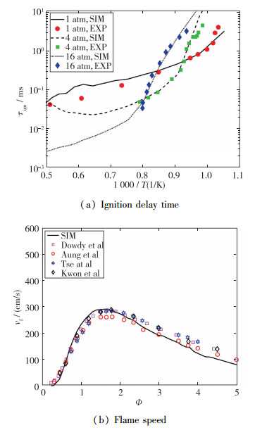 1 仿真验证 1.1 反应机理验证反应机理对于燃烧的仿真起着至关重要的作用, 本文采用氢气作为燃料, 反应机理采用经典的9组分19步氢气/空气燃烧简化反应机理[17], 并对其Arrhenius系数进行了部分修正.选取点火延迟时间和火焰传播速度两个指标来衡量简化反应机理的可靠性, 如图 1所示, 参考Kéromnès等[18]的实验条件进行点火延迟时间仿真, 参考Li等[19]的实验条件(常温常压)进行火焰传播速度仿真, 并和实验结果[20-23]进行对比.在3种不同压力下的整个温度区间上, 点火延迟时间的仿真结果和实验结果都非常吻合, 只有在1 atm(1 atm=101 325 Pa)的高温段仿真和实验略有差异; 在常温常压条件下, 整个当量比区间上, 火焰传播速度的仿真结果和实验结果都非常接近, 只是在当量比较大时稍有出入, 可以证明本文所采用的仿真机理是较为可靠的.