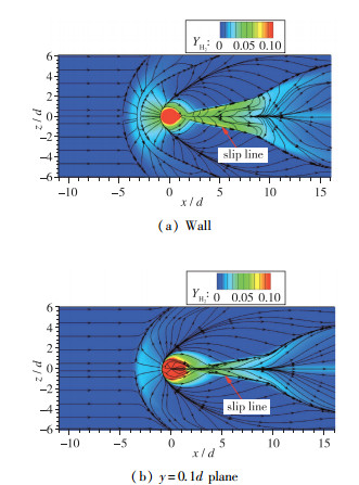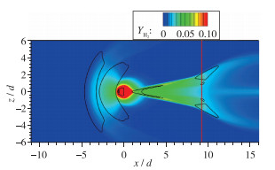 2 尾迹区掺混燃烧特性分析 2.1 冷态流场氢气掺混特性图 6展示了壁面上的氢气分布, 在射流出口下游的尾迹区中氢气的分布区域以红线为界大致可以分为两段, 红线之前的区域氢气浓度较高, 高浓度氢气分布区域的展向宽度随x坐标的增加而线性变化; 红线之后的区域氢气浓度较低, 且展向宽度随x坐标的增加而非线性变化.在横向射流的尾迹区中一般会形成V形回流区[16], 图 6中叠加了流向速度为0的等值线, 表示了V形回流区的形状.由于仿真中参照实验设定的边界层厚度只有1 mm, 所以图 6中V形回流区的两翼在中间变细并断开, V形回流区的壁面法向高度也很小, 前半段高度为0.05d, 后半段高度为0.025d.结合图 4(b)中的反射激波与壁面交会位置可知, 受到反射激波和壁面交会影响, 在下游V形回流区重现, 但是角度发生改变, 进一步向两侧扩张, 回流区面积变大, 同时, 在V形回流区的内侧还观察到了两个小的回流区.