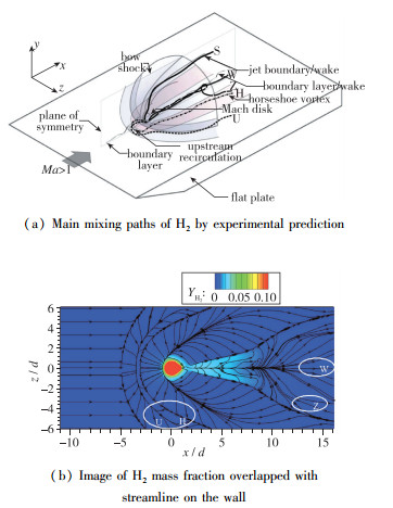 如图 11(a)所示, Gamba等[11]依据实验结果, 推测了主要的氢气掺混路径如下:路径S, 氢气自射流出口前侧喷出后, 穿过桶状激波系统, 流经射流的迎风侧向下游流动, 这是射流主流的流动路径, 是显而易见的; 路径W, 氢气自射流出口后方喷出后, 穿过桶状激波系统, 在射流出口下游的近壁面尾迹区流动; 路径Z, 前期和路径W一致, 在下游较远区域向外侧运动进入马蹄涡; 路径H, 氢气自射流出口喷出后流经上游回流区, 最后进入马蹄涡中; 路径U, 氢气自射流出口喷出后流经上游回流区, 在马蹄涡外围流动. 图 11(b)展示了热态流场叠加有流线的壁面氢气分布云图, 从图中可以看到与路径W对应的流线, 同时尾迹区中向两侧扩张的流线可对应于路径Z, 马蹄涡中两种不同的流线大致对应于路径U和H.