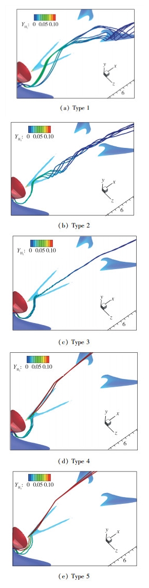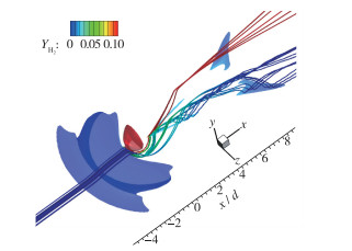 为了探究尾迹区的氢气掺混机理, 本文描绘了流经V形回流区的多种不同三维流线形态如图 12所示, 图中等值面为流向速度为0的等值面, 等值面和流线均用氢气质量分数着色, 等值面所包围的空间为回流区, 流经V形回流区的流线有多种形态, 表明尾迹区中的氢气的输运和掺混存在多种复杂方式, 不同来流流线从远至近绕过射流出口, 卷吸夹带氢气进入V形回流区不同区域发生燃烧.