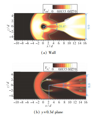 (3) V形回流区中的高浓度氢气对燃烧反应产生了一定的阻碍作用, 尾迹区中的火焰在壁面上较为猛烈但是随壁面法向高度增加迅速减弱, 尾迹区中火焰结构的端点随高度增加逐渐向下游移动, 受到射流主流影响, 尾迹区中的火焰展向宽度和火焰结构的角度在距离壁面0.5d位置处开始增大.