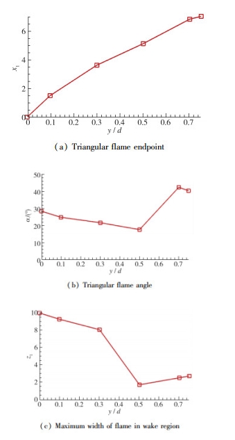 由于在y=0.75d截面以上位置, 上述火焰结构已经不明显, 因此提取在距离壁面0,0.1d,0.3d,0.5d,0.7d, 0.75d高度截面上的3个火焰结构参数, 观察其随距离壁面高度的变化如图 16所示.三角形火焰结构端点位置x1基本上随高度线性增加, 说明尾迹区火焰的结构在高度增加的过程中, 逐渐向下游移动.三角形火焰结构的角度α随着高度增加首先略有减小, 在y=0.5d位置之后迅速增加, 角度的增加可能是因为尾迹区火焰与氢气主流周围的火焰相接触使得尾迹区火焰结构发生变化; 火焰的最大展向宽度z1和α有相似之处, 随高度增加z1首先减小, 之后在y=0.5d位置开始增加.
