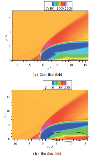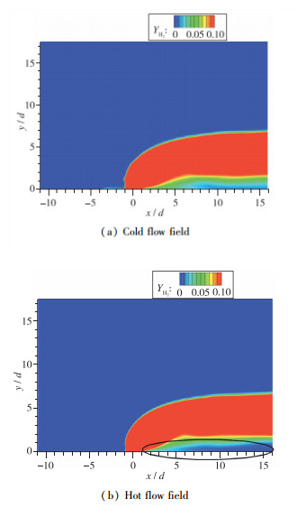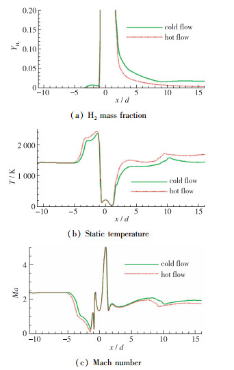 本小节对冷热流场进行对比分析, 定性对比如图 17, 18所示, 可以看到燃烧消耗一定量的氢气, 使得射流尾迹区中的氢气含量明显降低, 燃烧放热使得尾迹区中的温度发生明显升高.