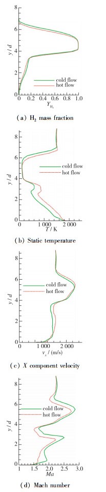 定量提取对称面内x=10d直线上的氢气质量分数、静温、流向速度、Mach数变化如图 20所示, 同样可以观察到尾迹区中氢气含量的降低和温度的升高.同时, 尾迹区中的流向速度略有增加, 但是Mach数出现明显降低, 说明燃烧产生的能量可能仍然以内能的形式存在, 没有充分转化为气体的动能.另外, 还可以观察到热态流场射流迎风侧剪切层中氢气含量明显降低, 温度和流向速度升高, 但是Mach数降低.