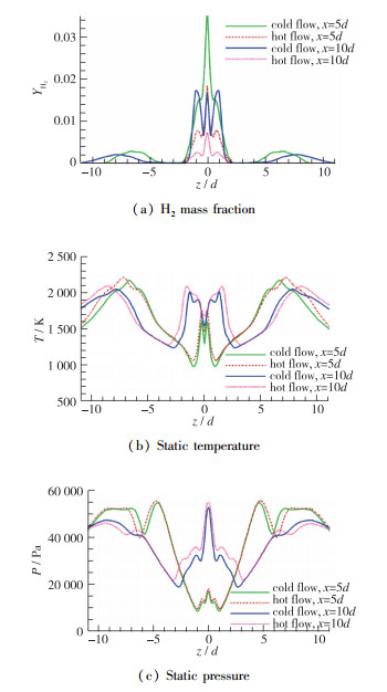 定量提取y=0.3d截面内x=5d和x=10d直线上氢气质量分数、温度和压力变化如图 21所示, 流场参数变化曲线表明在射流尾迹区中, 热态流场的氢气含量降低, 而温度和压力都有所上升.另外还观察到热态流场马蹄涡[31]中的氢气基本已反应完全, 这使得热态流场马蹄涡中的温度有所升高, 但是马蹄涡中的压力变化不明显, 部分区域中压力甚至出现降低的现象.