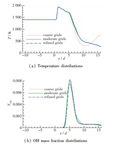 为保证网格的可靠性, 需要进行网格无关性验证.采用同样方法生成网格总量为2.2×106的粗糙网格和3.4×106的加密网格, 按照Gamba等[11]进行的实验给定仿真条件, 具体参数见表 1.对3种不同的网格进行仿真, 得到仿真结果.提取对称面内x=6d直线上的温度分布和OH质量分数分布如图 3所示, 中等网格和加密网格的温度分布曲线基本一致, 但是粗糙网格与两者存在较大差异, 3种网格的OH质量分数分布曲线基本一致.相比于加密网格, 中等网格精度基本没有损失, 而且对计算资源需求小, 因此2.76×106的中等网格适合于本文的仿真计算.