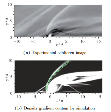 图 4展示了实验拍摄的对称面纹影图像和仿真得到的对称面密度梯度云图, 仿真成功捕获了弓形激波、桶状激波、分离激波、反射激波、Mach盘等结构, 在仿真结果中, 弓形激波和实验结果基本重合, Mach盘略高于实验结果, 分离激波产生位置向下游略有移动, 这可能和壁面边界条件有关, 仿真中壁面是无滑移、绝热的绝对平整壁面, 而实验中的壁面不可能绝对平整, 这可能导致分离激波提前产生.