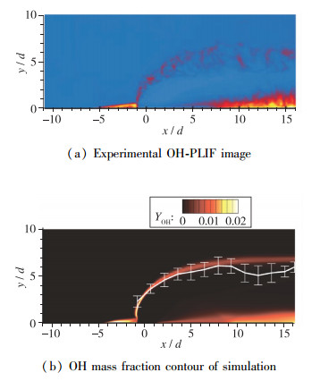 OH的浓度通常用来表示燃烧的剧烈程度, 实验方面主要采用OH平面激光诱导荧光技术(OH- PLIF)来观察OH的分布, 仿真相对于实验具有优势, 可以直接得到OH分布, 在本文中, 提取了对称面上的OH分布和实验的OH-PLIF图像进行比较, 如图 5所示, 与实验结果一致, 仿真结果中的OH主要分布在3个区域, OH分布最为密集的是射流出口上游的回流区, 长度从射流出口向上延伸到-5d的位置; 然后是射流出口下游的近壁面尾迹区, 在这一区域, 仿真和实验的OH-PLIF图像有微小差别, 实验中在紧邻射流出口下游的区域没有观察到OH, 仿真中存在一定量的OH, 同时此区域的OH浓度和OH分布层的高度也与实验有细微差别, 这可能和实验中的观察成像设备有关; OH浓度在射流迎风侧的剪切层中较低, 此处OH层的厚度和实验结果有一定差异, 这可能和RANS模型有关, 另外, 图 5(b)中还对比了实验和仿真火焰穿透边界, 图中白线为平均火焰边界, 误差棒表示均方根误差(RMS), Gamba等[11]在实验中利用多组瞬态数据平均得到火焰边界, 将其与仿真边界对比可以发现在x=10d之前的区域, 仿真与实验的火焰穿透深度基本一致, 但是在下游区域, 实验所测的火焰边界开始变小, 仿真与实验出现一定偏差.