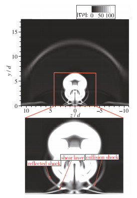 图 8为x=10d截面上的密度梯度云图以及放大图, 其展示了反射激波和壁面交会时的复杂相互作用, 反射激波、碰撞激波和剪切层三者相交后, 碰撞激波远离壁面, 而剪切层沿展向进一步扩展, 尾迹区中的氢气分布区域面积也开始变大, 氢气的浓度有所降低.另外, 对比图 9和图 8可以发现, 在壁面法线方向上, 尾迹区中的氢气被限制在剪切层内部, 但是在中心线位置氢气射流主流通过一个条形的氢气分布区域和尾迹区中的氢气相连.