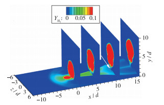 | 图 9 多截面氢气分布云图 Fig.9 Image of H2 mass fraction on the wall and span-wise planes |