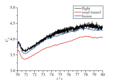 3.2 融合结果分析飞行试验前通过样本点风洞试验设计, 获得25组不同δP, δY, δR, Φ组合, 14个Ma∞和17个αΦ的轴向力系数(不含摩擦阻力和底部阻力部分)、法向力系数和俯仰力矩系数(参考点为弹体头部尖点), 构成方程个数等于未知量个数的方程组, 采用Gauss消元等方法可获得其风洞试验解. 通过对飞行试验的飞行参数、加速度计、角速度计等遥测数据处理分析、补充更多状态的相容气动数据, 选取合理的加权矩阵(本文应用实例认为风洞试验和飞行试验可靠度相当,选为单位矩阵), 构建方程个数多于未知量个数的超定方程组, 采用线性最小二乘广义逆法获得其风洞试验和飞行试验两源数据融合解. 图 1,2, 3分别给出了轴向力系数、法向力系数和俯仰力矩系数的风洞试验结果、飞行试验结果和气动辨识后的两源数据融合结果, 比较表明融合后的模型函数结果与飞行试验结果吻合度很高, 具有良好的工程应用价值.