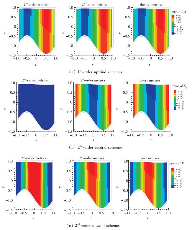 对于二维Euler方程, S的形式和式(6)类似, 不过有4个元素(S1,S2,S3,S4).在以下计算中F和G直接代入理论值, 采用3种格式离散Ix,Iy中的空间导数∂/∂ξ和∂/∂η, 数据分析时同样选择离开边界4排网格点的区域以便消除边界影响.导数和差商组合后共9种情况, 因为微分形式下的S为0, 所以此时计算得到的S本身就是离散误差, 其平均值如表 2所示.