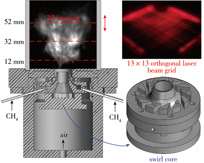 旋流燃烧器是航空发动机燃烧室的核心部件之一, 精确诊断旋流火焰温度场的二维分布对于发动机燃烧机理、热声振荡、形态转变等研究具有重要意义[1-3].燃烧室内部旋流、回流的复杂流场结构, 特别是燃烧状态下旋流火焰为高温湍流燃烧, 环境更加恶劣, 使得精确测量旋流火焰二维温度场极为困难.近年来, 以可调谐激光吸收光谱技术(tunable diode laser absorption spectroscopy, TDLAS)为代表的非接触式光谱测量方法因具备对流场多参数实时诊断的能力和对流场无干扰的优点, 已成为国际上燃烧诊断领域的发展热点[4-8].