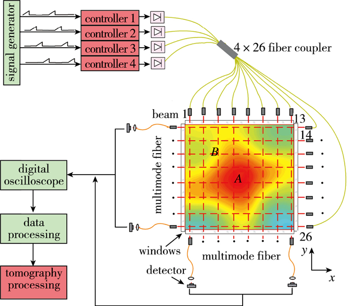 TDLAS-HT系统如图 2所示, 1台信号发生器产生4路脉冲锯齿波, 每路锯齿波频率均为10 kHz, 两两相位差90°, 同时调制4台激光控制器, 使4台DFB激光器1, 2, 3, 4分别输出7 185.6, 7 444.3, 6 807.8和7 466.3 cm-1波长的激光, 且两两激光不会叠加, 最终组合而成总调制频率为2.5 kHz的4波长激光器, 实现了HT方法的多光谱光源制备, 4路吸收波长光谱常数取自HITRAN2008数据库, 见表 2.合成HT光源由4×26光纤分路器分为26路, 每路光纤末端均装有准直器, 保证输出光束直径小于1 mm.光路1-13与光路14-26分别穿过燃烧室出口设定截面且垂直布置, 实现13×13的正交光路分布, 光束两两间隔均为7 mm, 即空间分辨率为7 mm.穿过流场的26个光束由收集器收集到多模光纤内, 分别导到26个InGaAs光电探测器, 转换为电压信号, 进而由高速数据采集仪存储, 数据整理后经反演运算程序, 重建火焰断面的温度场二维分布.