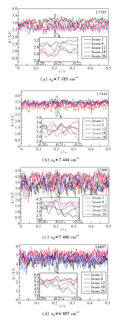 | 图 3 32 mm高度截面x-1, x-6, x-12及y-18, y-26共5路波长对应4个波长吸收率的时间变化曲线 Fig.3 Absorbance evolutions of the four absorption lines corres-ponding to the five light paths(x-1, x-6, x-12, y-18 and y-26) at the 32 mm height |