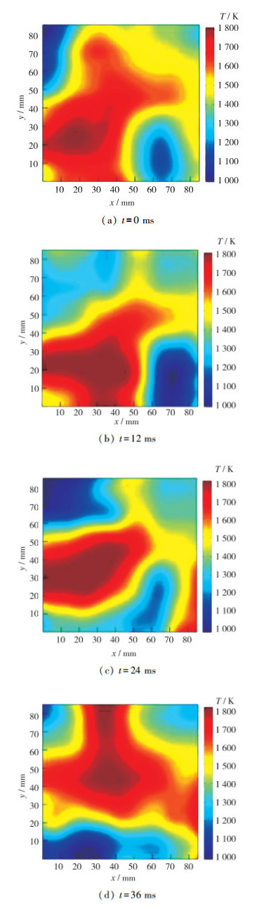 图 4展示了旋流火焰32 mm高度截面分别在0, 12, 24和36 ms时刻的温度场反演结果.由图 4可见, 12 ms时刻的燃烧核心区较0 ms时刻明显增大, 在24及36 ms时刻, 燃烧核心区出现明显的移动.上述结果表明, 该TDLAS-HT技术可清晰捕捉燃烧核心区成长及移动的动态信息, 温度场测量结果直观反映了旋流火焰的燃烧振荡.