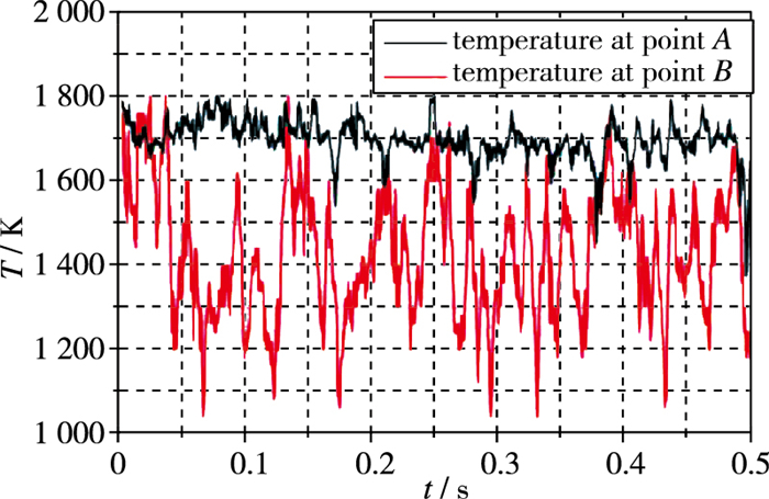 图 5给出32 mm高度截面A, B两点不同位置处温度的定量测量结果(见图 2, A点位于测量平面中心, B点偏离测量平面中心, 位于窗口与A点之间).观察图 5, 一方面, 在远离中心点处的B点温度有着较大幅度的波动, 这符合旋流火焰的燃烧振荡特性, 即燃烧核心区在不断移动; 另一方面, B处温度在该0.5 s测量周期内要整体低于中心点温度, 说明燃烧核心区虽然不停地移动, 但其区域范围基本覆盖住中心测点, 且从平均的时间尺度来看, 32 mm高度测量平面中心处温度要高于四周.