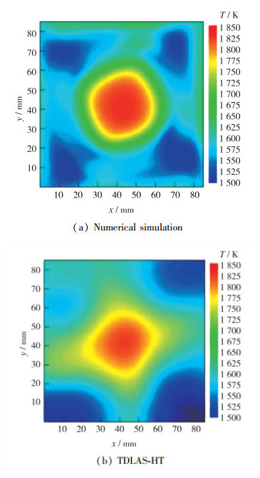 图 6展示了32 mm高度截面温度场在2 s内的平均值的数值计算(大涡模拟方法)和二维吸收光谱重建的对比.从图 6中可以看出, 温度场分布轮廓较为一致, 均为中心处最大温度, 约为1 700 K, 这也与图 5中给出结论一致; 四角温度最低, 约为1 300 K.上述结果说明重建结果较好地反映了旋流火焰的温度场的二维分布.