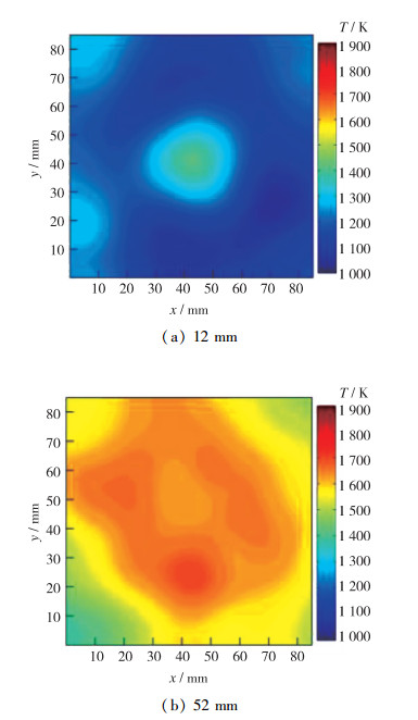 | 图 7 旋流火焰12,52 mm高度下重建温度场 Fig.7 Two-dimensional temperature fields for 12 and 52 mm height |