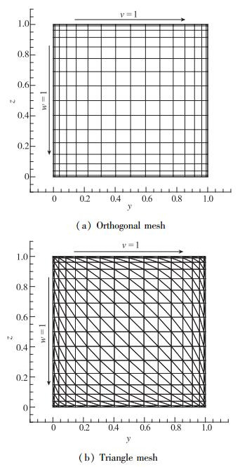 | 图 1 相邻双侧边盖驱动方腔流动的二维有限元网格离散(Ny=Nz=16) Fig.1 Triangulation of finite element mesh of two-sided non-facing lid driven cavity flows (Ny=Nz=16) |