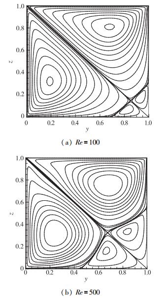 | 图 2 相邻双侧边盖驱动方腔流动的二维稳态基本流流线图(Ny=Nz=80) Fig.2 Stream lines of basic steady-state of two-sided non-facing lid driven cavity flow(Ny=Nz=80) |