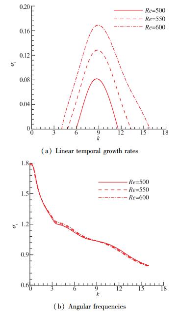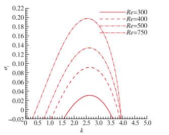 | 图 3 相邻双侧边盖驱动方腔流动不同Reynolds数下最不稳定驻定模态的线性时间增长率曲线 Fig.3 Linear temporal growth rates of most unstable stationary mode of the steady two-sided non-facing lid driven cavity flow with different Reynolds numbers |