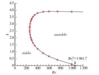 | 图 4 相邻双侧边盖驱动方腔流动最不稳定驻定模态的Re-k中性曲线 Fig.4 Neutral curve Re-k of the stationary unstable mode ofsteady two-sided non-facing lid driven cavity flow |
