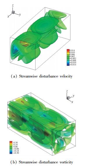 这里, ωx为流向涡量.相邻双侧边盖驱动方腔流动对称性同构于E(1)×Z2, 而流动线性失稳是从对称性被打破开始的, 并由此分叉到新的流动状态.最先线性失稳的驻定模态发生在非零的临界波数下, 因此平移不变对称性Tx0被打破.至于关于对角线的反射对称性Sd是否被打破, 需要画出驻定模态在临界点处的特征模态空间结构, 以此来判断Sd是否被打破.首先在临界点处线性增长率为零(σi=0), 如果失稳模态的离散特征向量记为X=Xr+iXi, 那么在临界点处的失稳模态空间结构可以由Re(Xei(kx-σrt))得到, 其中k为实波数, σr为角频率,Re表示实部取值; 然后, 就可以画出驻定不稳定模态在临界点处的流向扰动速度和流向扰动涡量的空间等值面分布, 如图 5所示.