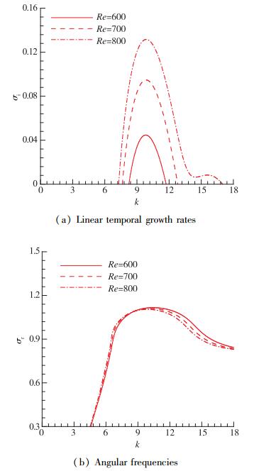 最后, 如果将驻定模态和两对行波模态的中性曲线放在一起, 尽管最不稳定的模态是驻定模态, 但它的临界点发生在中等波长区域, 并且截断波数随着Reynolds数增大趋于3.9.这样, 对于在x坐标方向受限的情况下, 如果x坐标方向受限尺度小于方腔高度(k>2π), 这时驻定模态无法出现, 而行波模态基于它的短波特征可能会最先失稳.
