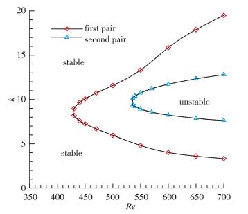 | 图 8 相邻双侧边盖驱动方腔流动两对对称行波模态的Re-k中性曲线 Fig.8 Neutral curves Re-k of two pairs of symmetrical travelling unstable modes of steady two-sided non-facing lid driven cavity flow |