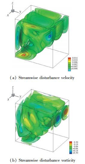 在图中可以清楚地看到不稳定行波模态发生在很大的波数下, 这将对应于短波不稳定; 随着Reynolds数的增大, 不稳定的波数区间也增大, 两对行波模态的最大时间增长率分别发生在k=9和k=10附近.由于每对行波模态的角频率大小相等、符号相反, 在图 6(b)和图 7(b)中只给出了不同Reynolds数下符号为正的角频率曲线(对应向下游传播的行波模态).从角频率曲线中可以看出, Reynolds数的变化对角频率的影响不大.但是, 对于图 6(b)的行波模态, 波数的增加伴随着角频率的减小; 而对于图 7(b)的行波模态, 波数在增加的过程中, 角频率先显著增大, 然后再缓慢减小.进一步地, 两对不稳定行波模态的Re-k中性曲线在图 8中给出.从图中可以容易地得到第1对行波模态的临界Reynolds数为Rec=428.4, 对应的临界波数为kc=8.6;而第2对行波模态的临界Reynolds数为Rec=533.1, 对应的临界波数为kc=9.8.第1对行波模态的上沿截断波数随着Reynolds数的增大而显著增大, 而下沿截断波数随着Reynolds数的增大而减小, 但是减小的趋势变得越来越缓慢.类似地, 可以画出第1对行波不稳定模态在临界点处的流向扰动速度和流向扰动涡量的空间等值面分布, 如图 9所示.