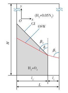 1.3 计算构型图 1为激波诱导火焰界面不稳定的二维计算区域示意图, 计算区域为L×H=0.1 m×0.48 m的长方形.图中灰色区域为H2+O2预混可燃气体, 白色区域为H2+0.05N2轻质气, 两种介质由于密度的不同而形成一气体界面(GI).初始条件下, 两种气体均以速度u0=2 250 m/s由下而上运动, 此时一道斜激波(图 1红线所示)与运动气体及其界面相互作用, 这一相互作用过程会使得斜激波和界面均产生偏转.本文给定界面的偏转角为δ=30°, 波前气体温度T0=298.15 K和压力p0=20 atm, 并令初始时斜激波角度为β1, 界面作用后的角度β2, 则由斜激波关系式可以分别得出β1=68.5°和β2=42.4°.当气体界面与斜激波作用后, 由于波后界面两侧气体的密度不同, 从而导致波后界面两侧气体的运动速度不同, 随着时间的进行, 界面逐渐发展为Kelvin-Helmholtz (K-H)不稳定状态, 从而进一步促进界面两侧H2+O2预混气和H2+0.05N2轻质气的混合及燃烧.波前H2+O2预混气和H2+0.05N2轻质气的充填比设置为l1:l2=1:3.