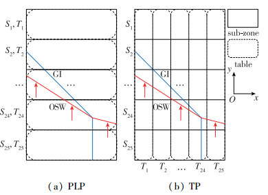 针对本文斜激波与反应性界面相互作用下的PLP和TP两种建表方式可如图 2所示.本文所有算例划分的计算子区均为25个, 图 2(a)中, 相同的矩形子区(S1-S25)沿y方向划分, 每个子区分别建立自己的数据表(T1-T25), 计算过程中, 数据表仅处理自己对应的子区内的化学反应; 图 2(b)中, 流场子区与数据表的排布方式互为转置, 每个数据表仅处理所有子区相同位置的数据簇, 处理结果返回相应的子区位置.