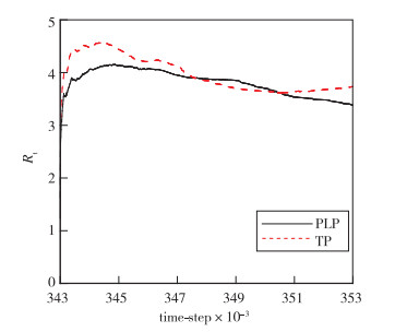 式中, tDI为采用DI算法计算化学反应所耗费的CPU时间, talgorithm为采用本文算法计算化学反应所耗费的CPU时间.由此可知, 采用算法耗费的时间越少, 则加速比越大, 计算效率越高. 图 3给出了两种并行建表策略下的PLP算法和TP算法计算得到的Rt随计算过程的变化.可以发现, 两种算法下Rt都经历了快速上升、达到最大值后缓慢下降并趋于平缓的过程, 两种算法的Rt变化差异不大.在计算终点时刻(时间步长为353 000), TP和PLP算法的加速比分别是3.73和3.39, 这说明两种策略均能有效提高计算效率, TP策略较PLP策略显示了更好的加速效果.