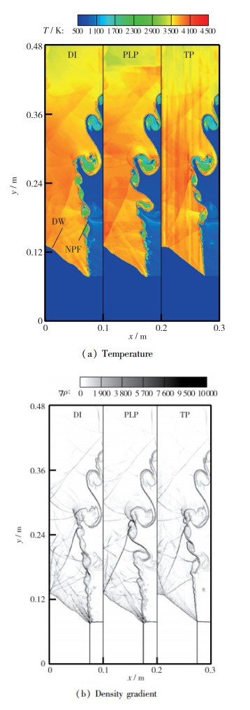 图 4给出了时间步长为353 000时, 两种算法(PLP和TP)以及DI方法计算得到的流场分布.结果表明, 燃烧场存在两个明显特征:首先, 在预混气体区(靠近左边界处), 燃烧是以爆轰波(DW)的形态发展的, 此时, 反应阵面(以图 4(a)温度分布表征)和激波阵面(以图 4(b)密度梯度表征)强烈耦合; 其次, 气体界面处的燃烧是以非预混燃烧的方式进行的, 火焰阵面(non-premixed flame, NPF)具有多尺度的涡旋结构.从图中的结果来看, 两种并行建表策略下的算法与DI方法得到的流场温度、波系结构和涡旋结构相差不大.需要说明的是, 在分层气体的界面附近存在沿下游逐渐增大的涡系结构, 不同算法得到的这些涡结构在细节上仍然存在着一定差异, 这种差异是由界面处K-H不稳定的内在性质所决定的, 不可能完全消除.