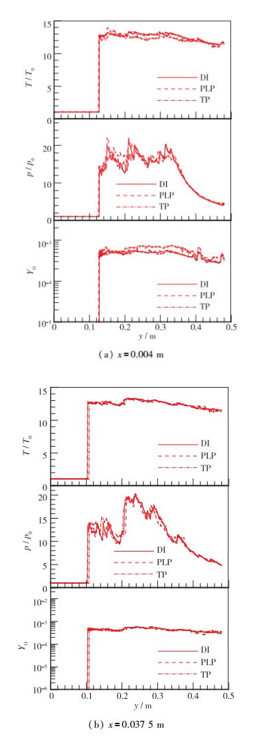 为定量考察算法的计算准确度, 图 5给出了两种算法分别在左边界附近(x=0.004 m)和H2+O2预混气充填区中间位置(x=0.037 5 m, 即l2/2处), 流场温度、压力和典型活性组分O的质量分数沿y方向的变化曲线. 图 5(a)中, 由于爆轰波会在左边壁面发生反射, 导致左边界附近热力学状态变化剧烈, 因此, 两种算法计算结果与DI结果表现出一定差异, 其中TP算法较PLP算法高估了计算的温度和低估了计算的O质量分数; 图 5(b)中, 由于反应区远离壁面, 其热力学状态的变化变缓, 因此两种算法与DI方法的计算结果更加接近.