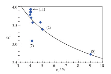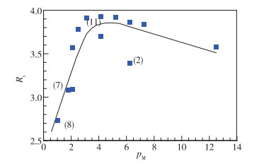 | 图 6 Rt与pM的关系曲线(图中数字代表表 1中的算例序号) Fig.6 Relationship between Rt and pM (the number in figure represents the sequence number of the cases in Table 1) |