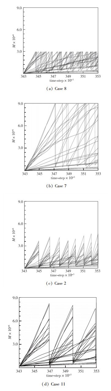 图 7(a)对应的是加速比最低的算例8(Rt=2.73)的表删除/增长行为, 可以发现由于该算例单表容量过小(Msin=3×106, 见表 1), 即使总表容量很大(Mtot=72×106), 每个数据表还是很容易增长到单表容量上限, 因此使得数据表的删除变得频繁; 另外, 由于每个表增长快慢也不相同, 因此表的删除也不同步.这种频繁和非同步删除数据表的行为导致了最低的加速比. 图 7(b)和(c)分别对应了两种中等加速比的算例7和算例2(Rt=3.08和3.39).在图 7(b)中, 算例7单表容量和总表容量都很大(Msin=9×106, Mtot=126×106), 尤其是后者, 因此表的删除/增长行为主要受单表容量控制, 因此较大的单表容量使得数据表的删除频率明显下降, 这是导致算例7比算例8加速比提高的主要原因, 但由于表增长快慢的不同, 删表并不同步, 因此其加速比提高得并不显著. 图 7(c)代表了与图 7(b)相反的另一种情况, 由于此时总表容量下降至Mtot=36×106, 因此, 数据表的删除主要受总表容量控制, 当数据表尺寸的总和达到总表容量时, 所有数据表都被删除, 这意味着表删除的同步性得到增强, 但由于总表容量小, 表删除仍过于频繁, 因此该算例的加速比提高得也不显著. 图 7(d)的表删除/增长行为代表了计算加速比最好的情况, 即较大的单表容量(Msin=12×106)和适当的总表容量(Mtot=72×106)保证了较低的删表频率和较强的同步性, 因此化学加速比达到最大.