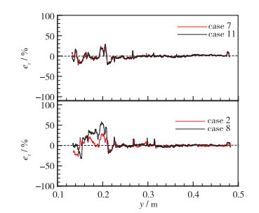 3.2.2 计算准确度为进一步考察不同数据表容量对计算效率的影响, 仍取算例8, 7, 2和11的结果进行分析. 图 8给出了时间步长为353 000时, 4个算例在x=0.004 m处压力的相对误差(er)的变化曲线.可以发现, 4个算例的压力相对误差在y=0.14~0.22 m范围内均存在明显波动.由于该范围对应了爆轰波在壁面反射的波后区(见图 4), 其热力学状态沿空间变化较大, 从而导致算法的预测出现较大误差.进一步可以发现, 算例7和11的相对误差要小于算例2和8.前两个算例对应的是大尺寸数据表的情况, 而后两个算例对应的则是小尺寸数据表的情况, 如图 7所示, 这意味着算法的计算准确度和计算效率之间存在一定关系.