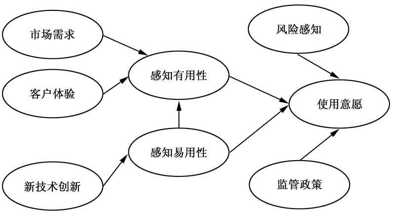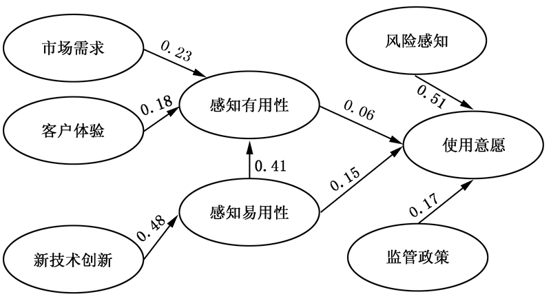 在该模型中,本文将市场需求和客户体验两个因素作为感知有用性的外部变量,将互联网金融中的新技术创新作为感知易用性的外部变量;对于使用意愿而言,将风险感知和监管政策作为其外部变量。