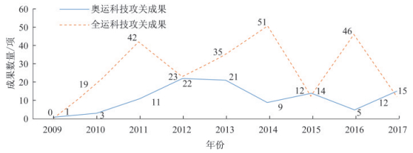 2.2.5 成果数量随奥运年变化奥运全运科技攻关成果的形成与奥运全运时间周期紧密相关。按立项时间对2009—2017年上海奥运全运科技攻关成果进行统计,结果如图 1所示。奥运科技成果立项数量在奥运年及前后一年数量最多, 这与奥运科技成果紧紧围绕国家体育总局制定的“奥运争光计划”有关。全运科技攻关成果在奥运科技攻关成果数量减少时却呈现递增的趋势,这与奥运全运的周期不一致相关。