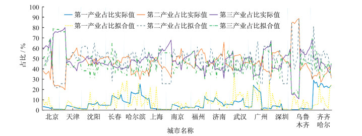 | 图 1 举办过重大体育赛事城市的细分产业占比拟合曲线 Figure 1 Fitting curve of the proportion of the three major industries that have held major sports events |