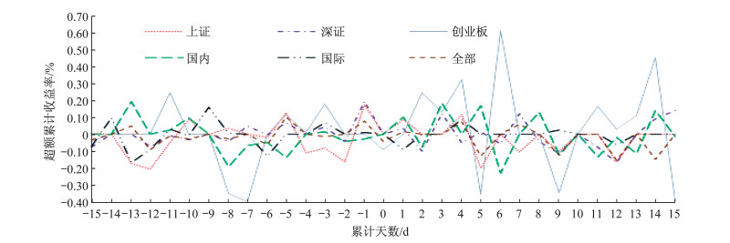 | 图 2 上证、深证与创业板市场中事件日及前后15 d累计平均超额收益率趋势 Figure 2 Trend of CAR between the 15th day before and after the event date in the SSE, SZSE and GEM markets |