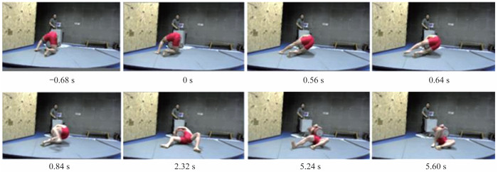 2 结果 2.1 滚桥技术动态体位姿势图 1是一位受试运动员在滚桥技术不同时刻的体位姿势,其中-0.68 s为准备姿势,0 s和0.56 s展示了双腿蹬伸环节姿势,0.64~5.24 s展示了右腿蹬伸环节姿势,5.60 s展示了仰面滚动环节起始姿势。