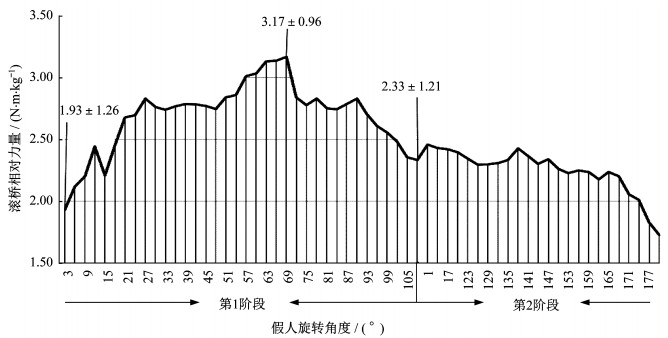 | 图 2 0~180°旋转区间内滚桥技术相对力量变化 Figure 2 Relative torque-angle curve of side-rolling technique during 0-180 degrees |