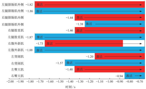 | 图 3 滚桥技术12块肌肉预激活时序 Figure 3 Preactivation sequence of 12 muscles of side-rolling technique |