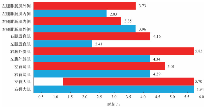 3.2.2 滚桥技术的肌肉工作时程分析肌肉失活时序反映了肌肉工作时间的长短,在一定程度上肌肉持续时间越长说明该肌肉参与滚动用力的贡献水平越高。如图 4所示,右臀大肌、右腹外斜肌的肌肉激活时间几乎涵盖滚桥技术全程,说明右臀大肌、右腹外斜肌是滚桥技术滚动用力的核心肌肉。左背阔肌、左臀大肌、右背阔肌、左腹外斜肌、右腿股直肌持续时间为4.16~5.01 s,说明这些肌肉在一定时间范围内参与了滚桥技术,其作用需根据表面肌电测试情况及其解剖学功能确定。需要注意的是,左臀大肌在0~1 s内处于失活状态,说明在双腿蹬伸环节中,左臀大肌没有参与用力。左腿股直肌激活时间最短,仅为2.41 s,说明右腿蹬伸环节中离地的左足被带动至身体后方之后,左腿未再参与蹬伸用力。
