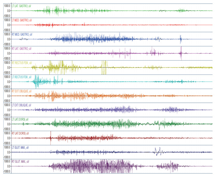 | 图 5 一位受试运动员使用滚桥技术时12块肌肉电信号示意 Figure 5 Original EMG of 12 muscles of one athlete when using side-rolling technique on testing machine |