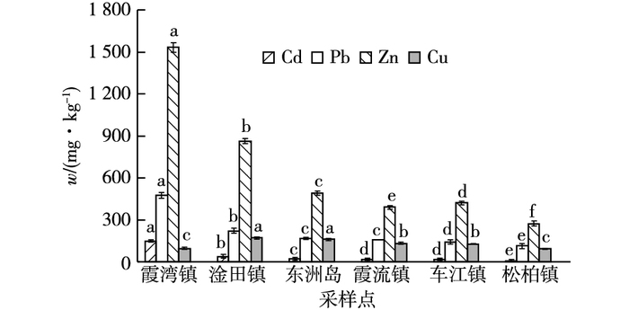 2 结果与分析 2.1 湘江中游沉积物典型重金属含量湘江中游江段沉积物重金属含量测定结果如图 2所示。湘江中游沉积物中重金属Cd、Pb、Zn和Cu污染严重; 各采样点重金属含量差异极显著(P < 0.01);尤其是Zn含量极显著高于其他3种重金属。各采集点沉积物Cd、Pb、Zn和Cu含量远高于湖南省土壤背景值, 分别为背景值的83.1~1 178.7、4.46~15.9、2.88~16.1和3.35~6.22倍。从整体上看, 湘江株洲段(霞湾和淦田镇)重金属含量明显高于湘江衡阳段(东洲岛、霞流镇、车江镇和松柏镇)重金属含量。